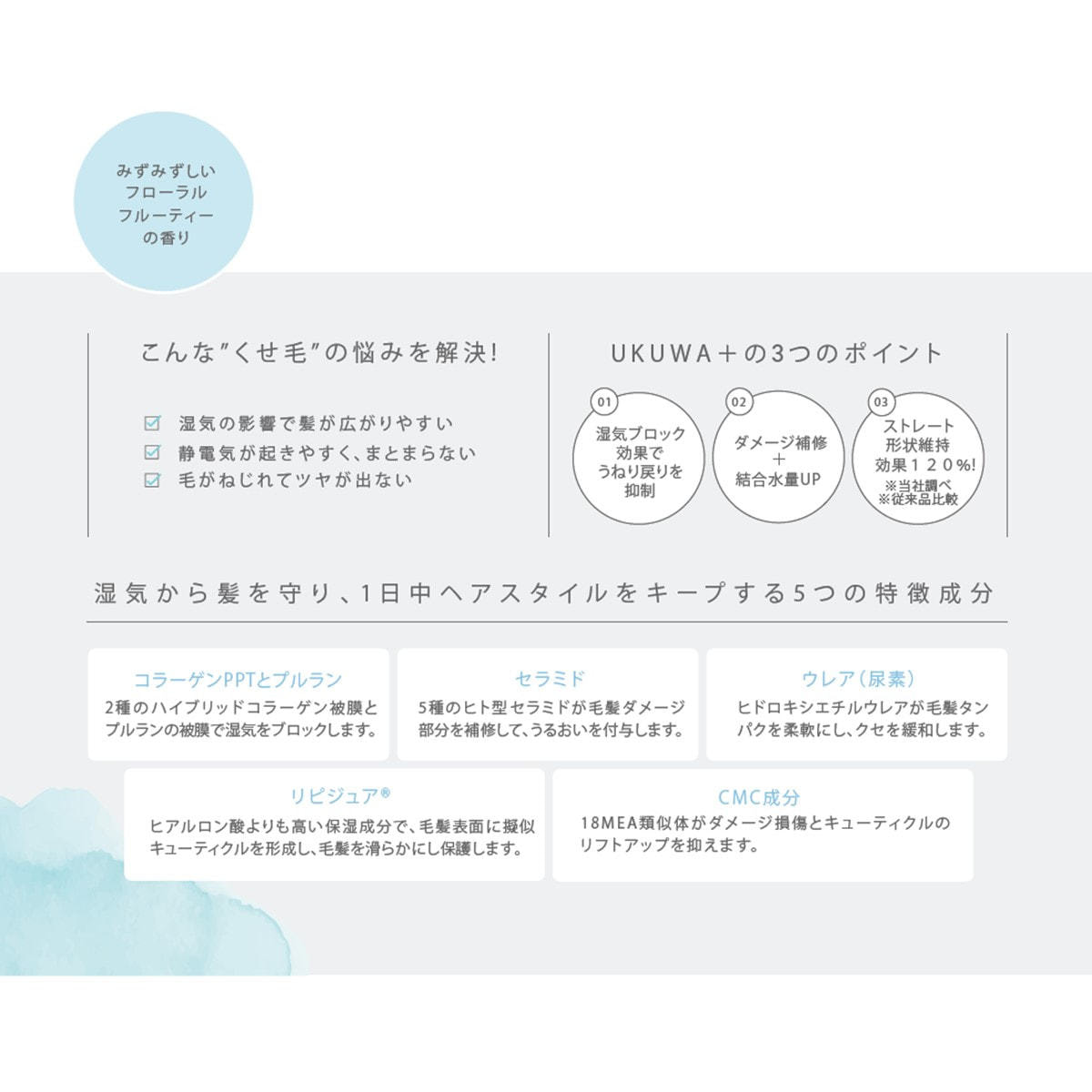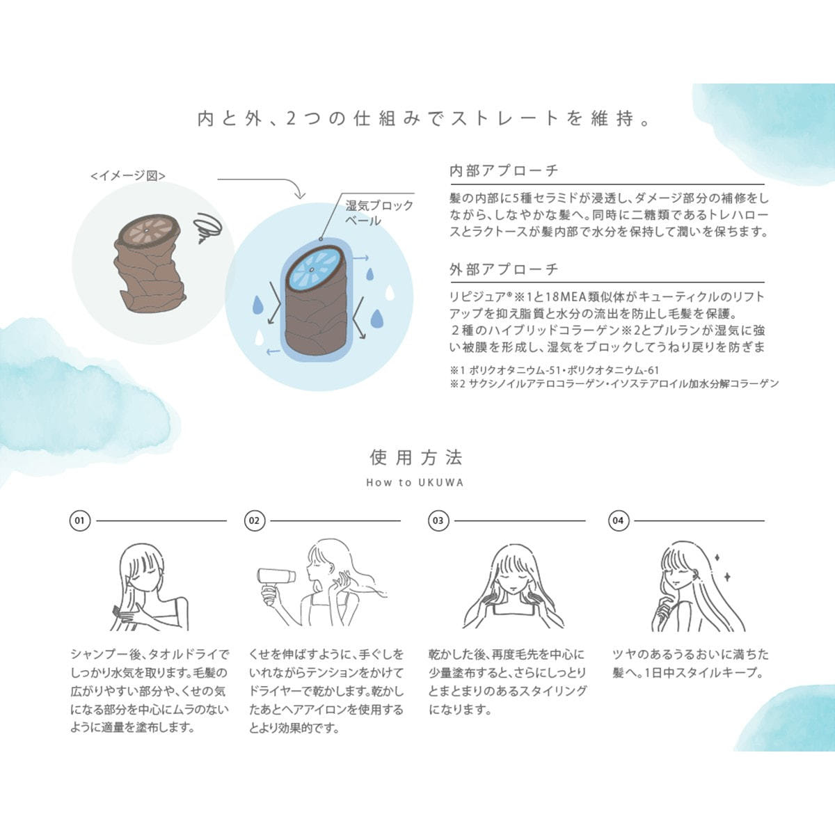 UKUWA+は毛髪内部にたっぷりと水分を補給し、キューティクルには湿気から髪を守る被膜を形成することで