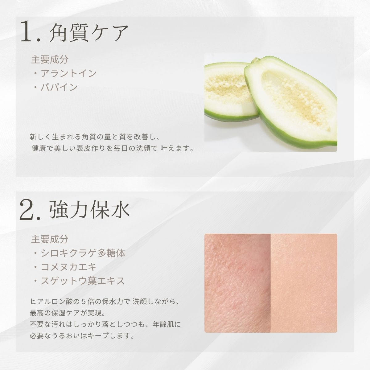 ヒアルロン酸の5倍の保水力(シロキクラゲ多糖体)で洗顔しながら最高の保湿ケアが実現。