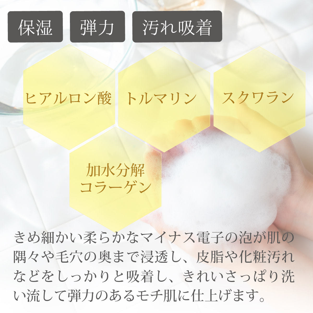スクワラン、コラーゲン、ヒアルロン酸、トルマリン