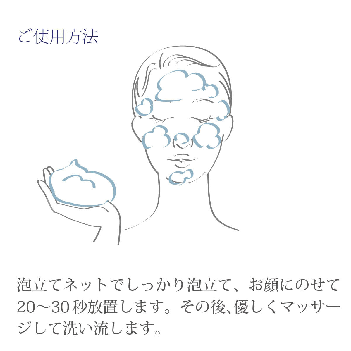 クレンジング後、顔を水でぬらしソープを両手のひらで泡立て、顔を包みこむようにして洗い、水またはぬるま湯で十分に洗い流してください。